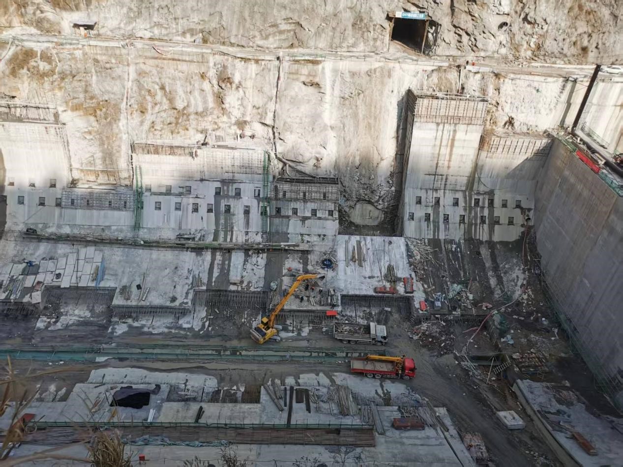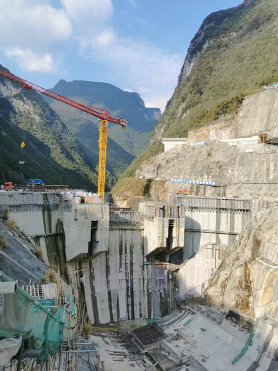 枢纽工程:一是大坝工程。大坝碾压混凝土浇筑至高程514.3m,正在开展下一仓碾压混凝土浇筑的备仓工作;二是水垫塘、二道坝。水垫塘、二道坝土石方开挖完成,水垫塘固结灌浆已完成,正在开展拱座及贴坡墙混凝土浇筑施工以及开展护坦、海漫段土石方开挖施工,二道坝溢流面抗冲耐磨混凝土浇筑施工;三是引水发电工程,发电引水隧洞洞挖及混凝土衬砌施工已完成,正在开展厂房梁、柱等结构混凝土浇筑施工;四是灌浆工程。左岸两层、右岸三层灌浆平洞洞挖、回填、固结灌浆完成,左岸顶层、底层灌浆平洞主帷幕灌浆施工已完成,右岸底层灌浆平洞搭接帷幕灌浆已完成,正在开展主帷幕灌浆施工,右岸中层灌浆平洞搭接帷幕灌浆施工已完成,正在进行主帷幕灌浆抬动孔施工及帷幕灌浆施工准备工作,右岸顶层灌浆平洞正在进行主帷幕灌浆施工。